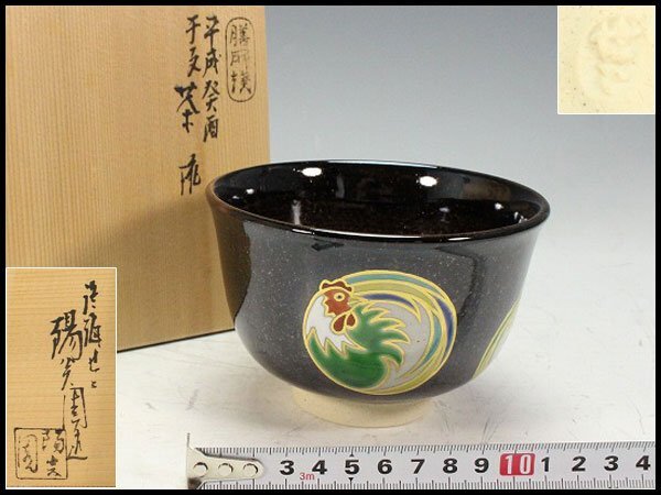 - 【金閣】茶道具 膳所焼 岩崎新定造 干支茶碗 酉 色絵 抹茶碗 和食器 共箱 旧家蔵出 送料無料(YC481)