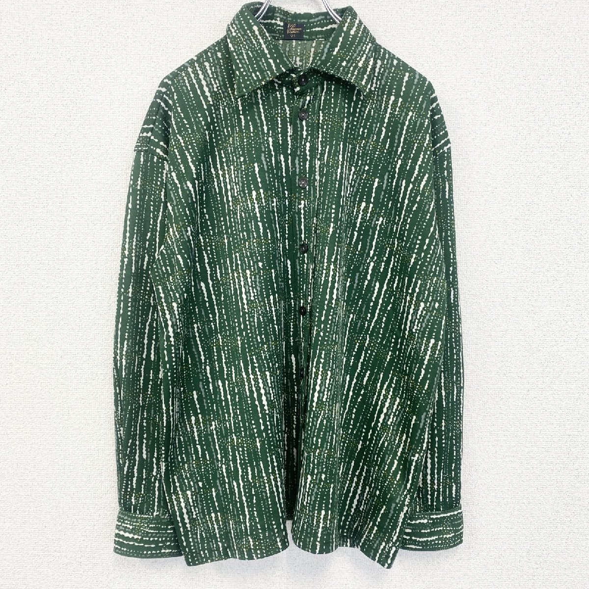 > 古着 used 長袖プリント総柄シャツ レトロデザイン ストライプ 個性的 派手 カジュアル カラフル 緑 グリーン