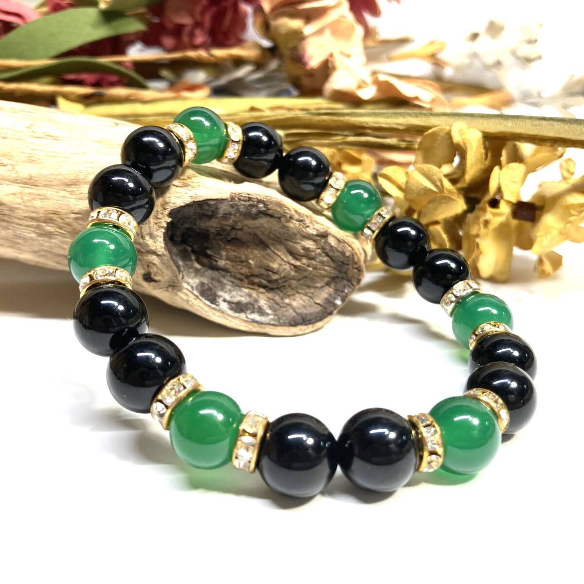 > モリオン&緑瑪瑙 パワーストーン ブレスレット 天然石ブレス (ゴールド) 10mm メンズ・レディース 厄除け 健康運 ☆