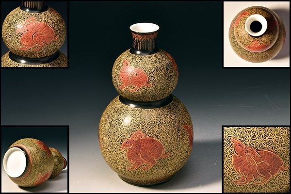 - SP4938 陶漆 蒟醤 キンマ 細密 瓢瓶 徳利 酒器 酒次 酒注 花入 花器 壷 陶胎漆器 磁胎漆器
