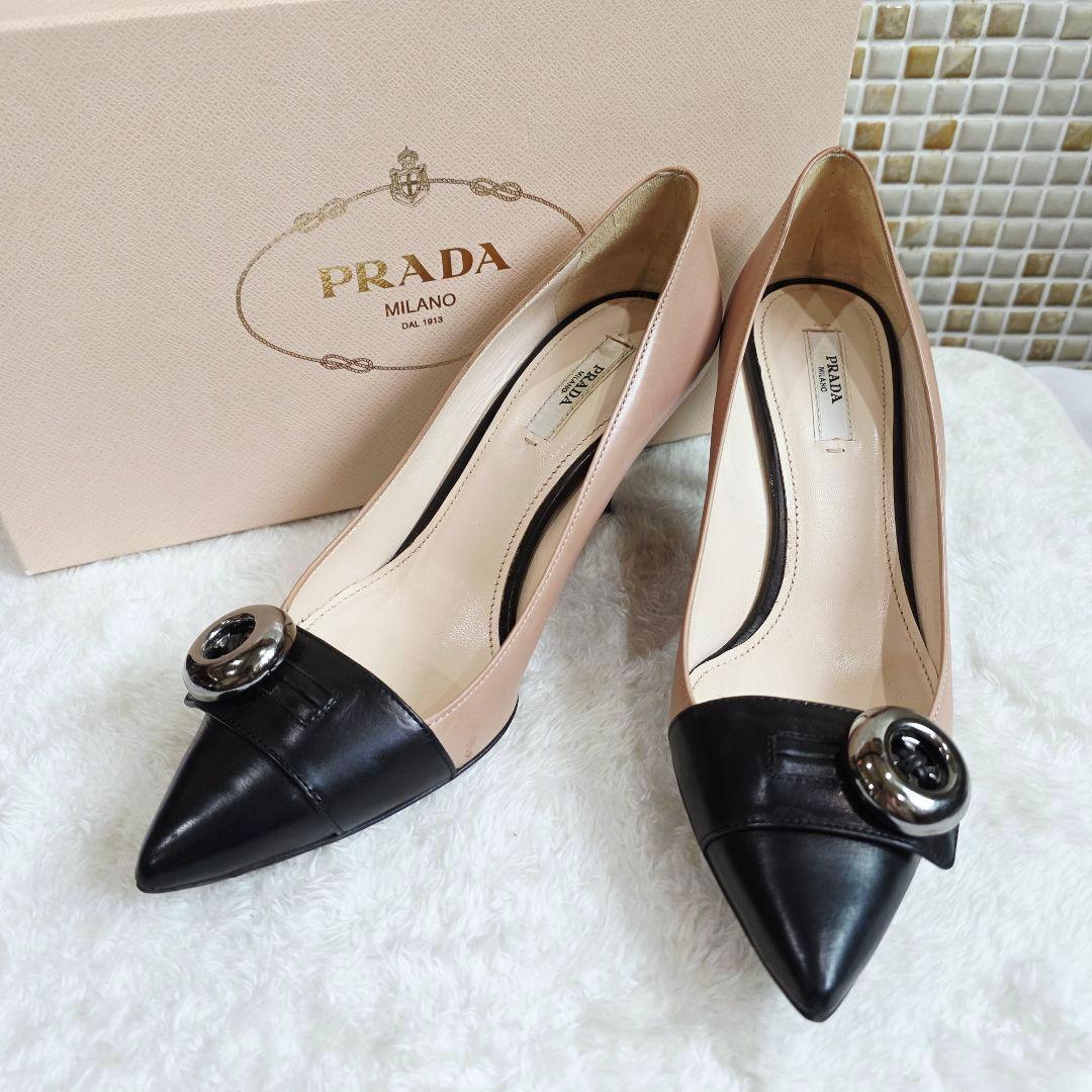 - PRADA(プラダ)レザー ツートン パンプス ハイヒール ボタン ポインテッドトゥ 37 ピンクベージュ×ブラック