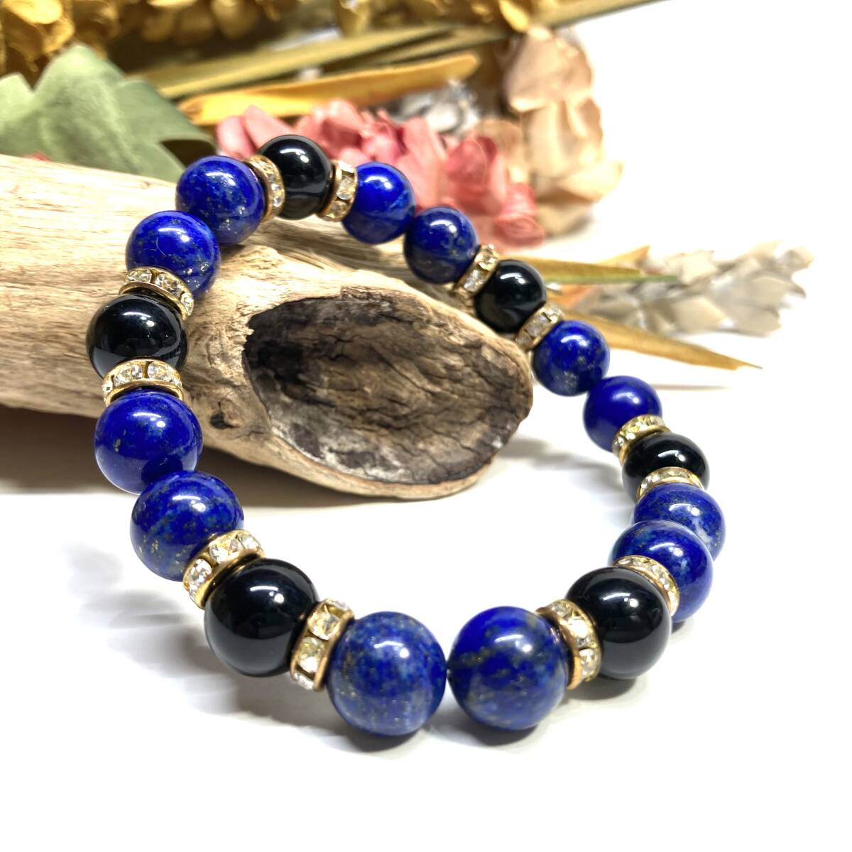 > ラピスラズリ&オニキス パワーストーン ブレスレット 天然石ブレス (ゴールド) 10mm メンズ・レディース 幸運 仕事運 学業運 ☆