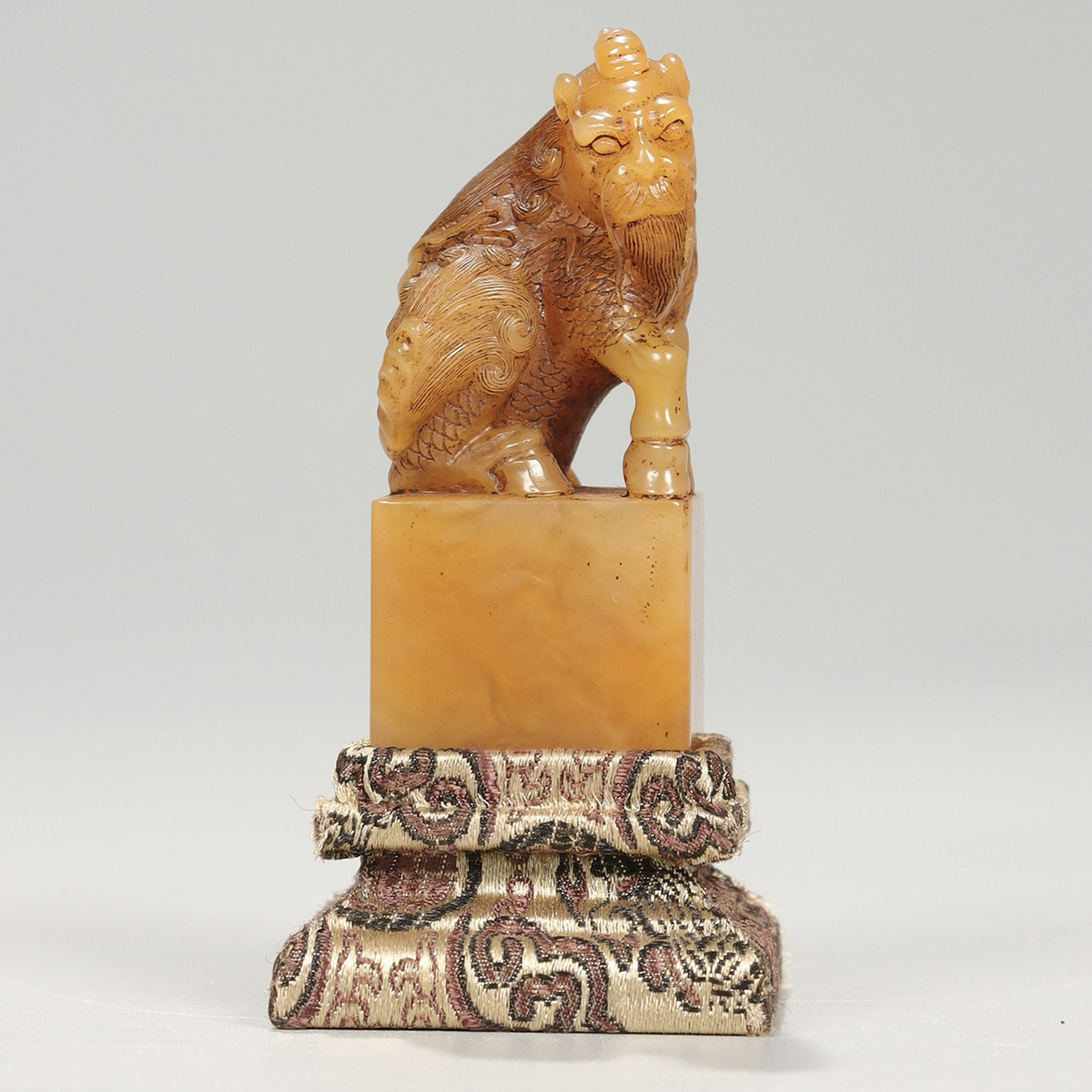 - ▽鴻▽清朝時代 寿山石 田黄石彫 麒麟鈕印章 耐青作 箱付 時代物 中国古美術 骨董品