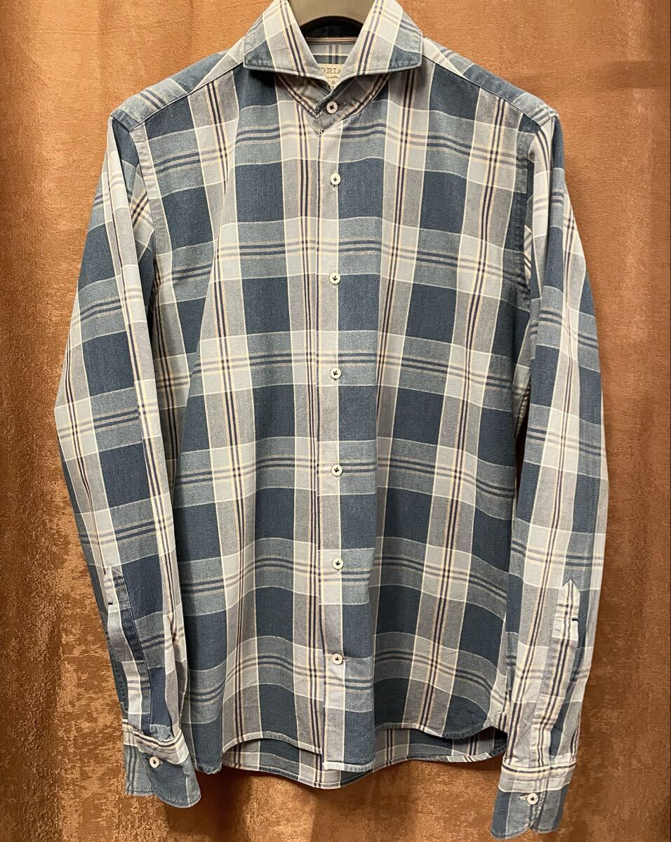 - MADE IN ITALY製 ORIAN DENIM DIVISION Slim Fit 長袖デニムチェックシャツ ブルー×ライトブルー Sサイズ オリアン イタリア製 長袖シャツ