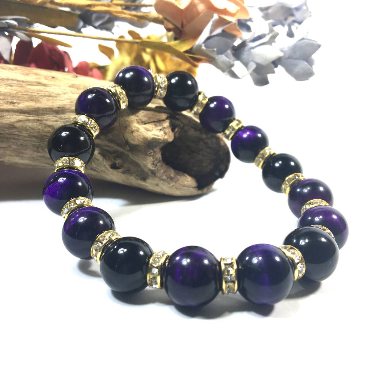 - パープルタイガーアイ&オニキス パワーストーン ブレスレット 天然石ブレス (ゴールド) 12mm 幸運 開運 メンズ 男性♪