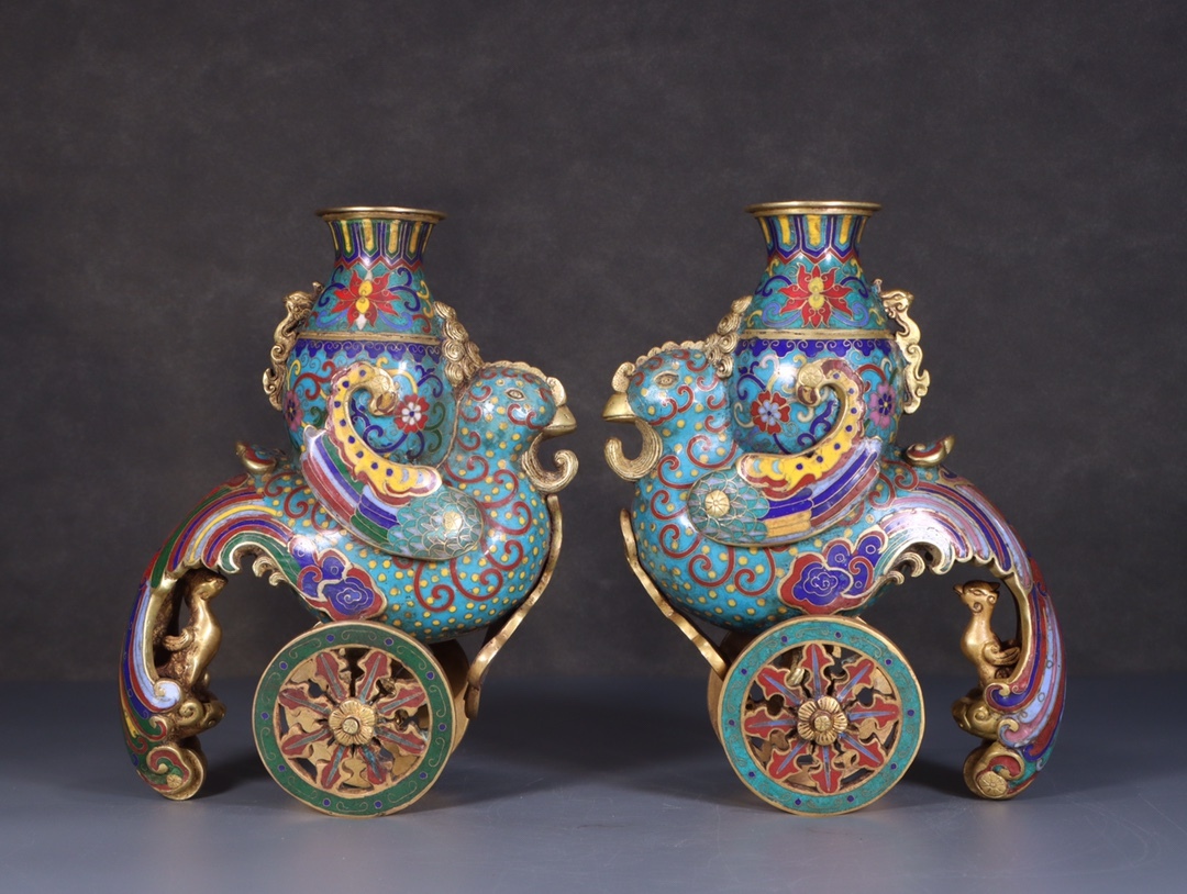 - ▽鴻▽清朝時代 古銅塗金彫 金絲景泰藍 琺瑯彩天鶏樽一対 乾隆年製 金水厚重 時代物 中国古美術 骨董品