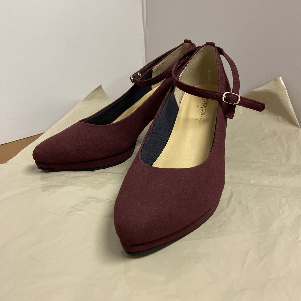 - s604 chocolate アンクルストラップ付きパンプス ワインレッド 24cm ヒール高さ約7cm ベロア
