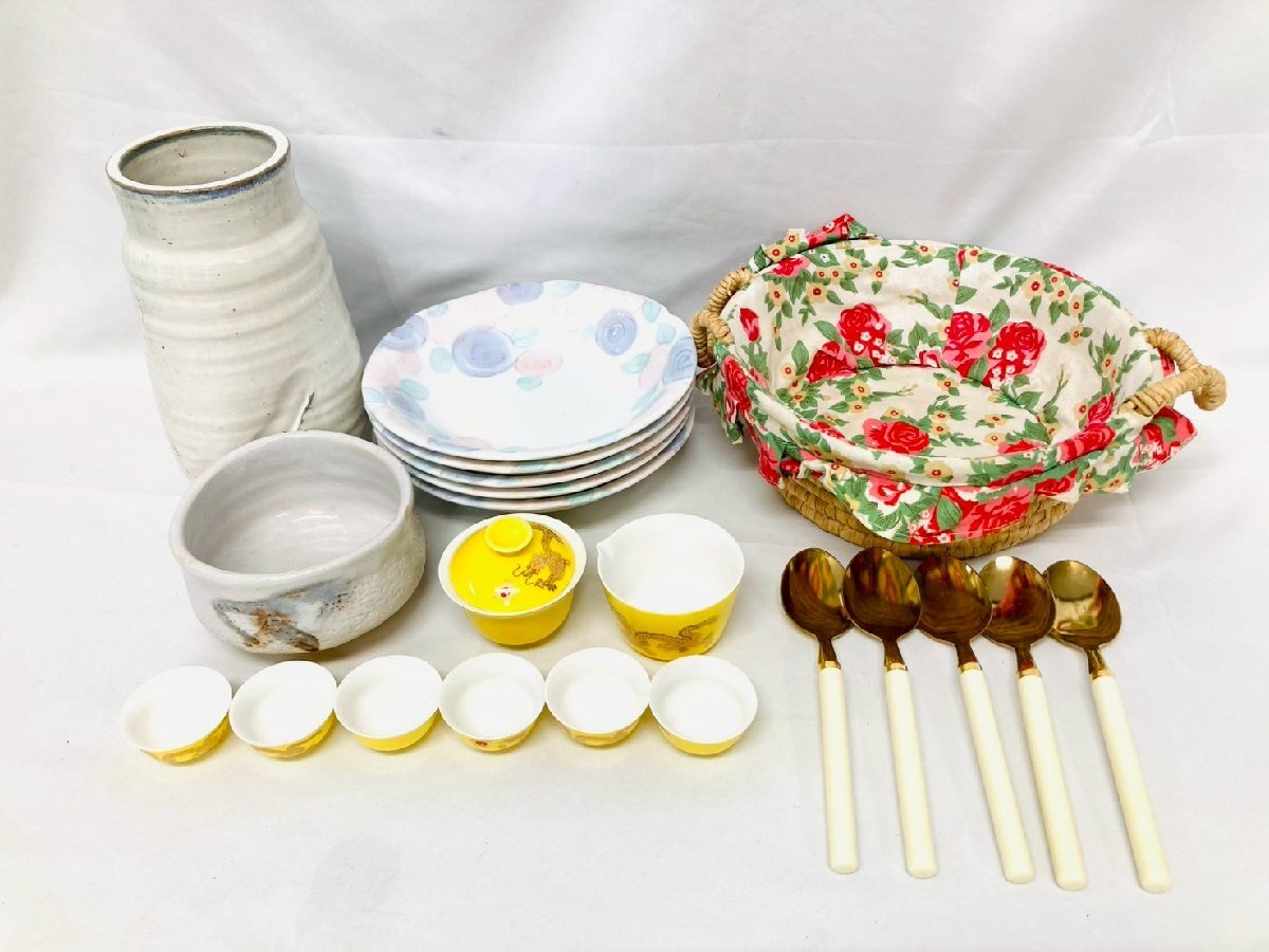 > ★陶器 食器 おまとめ 約3kg以上 カゴ スプーン お皿 お椀 湯呑み 茶道具 木箱付★⑥