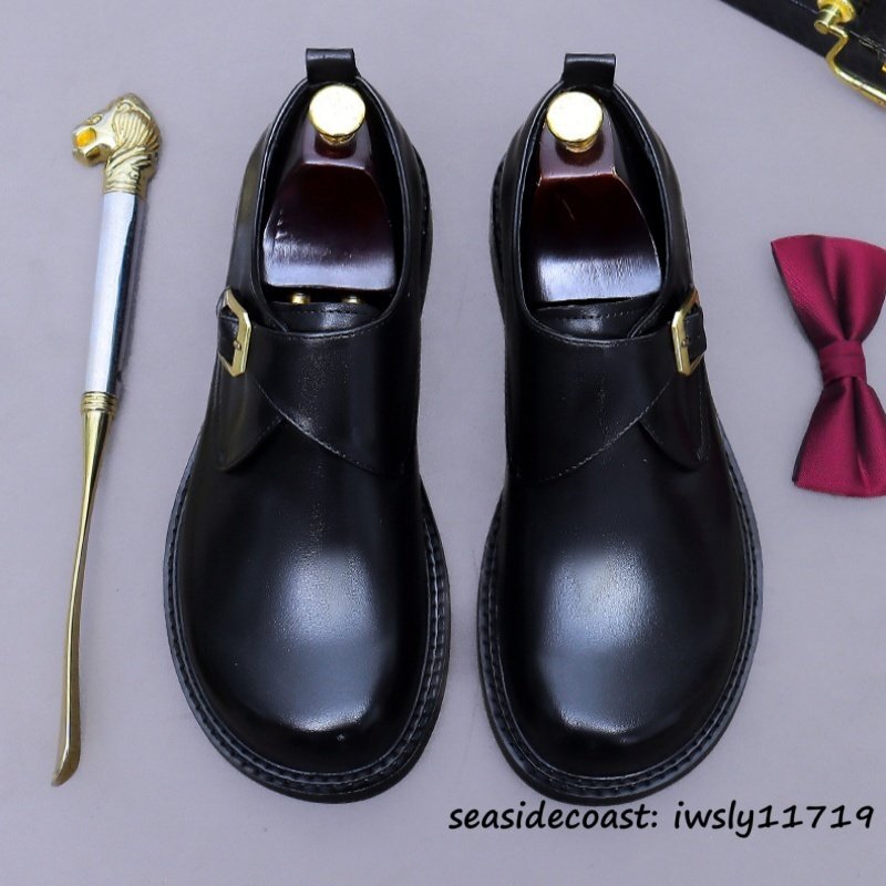 > 超希少◆定価9万超 本革レザーシューズ メンズ 職人手塗り上げ モンクストラップ 厚底 高級牛革 紳士靴 革靴 新品 結婚式 ブラック 25.0cm