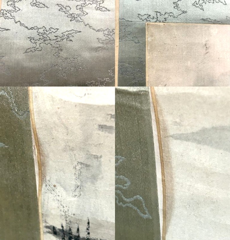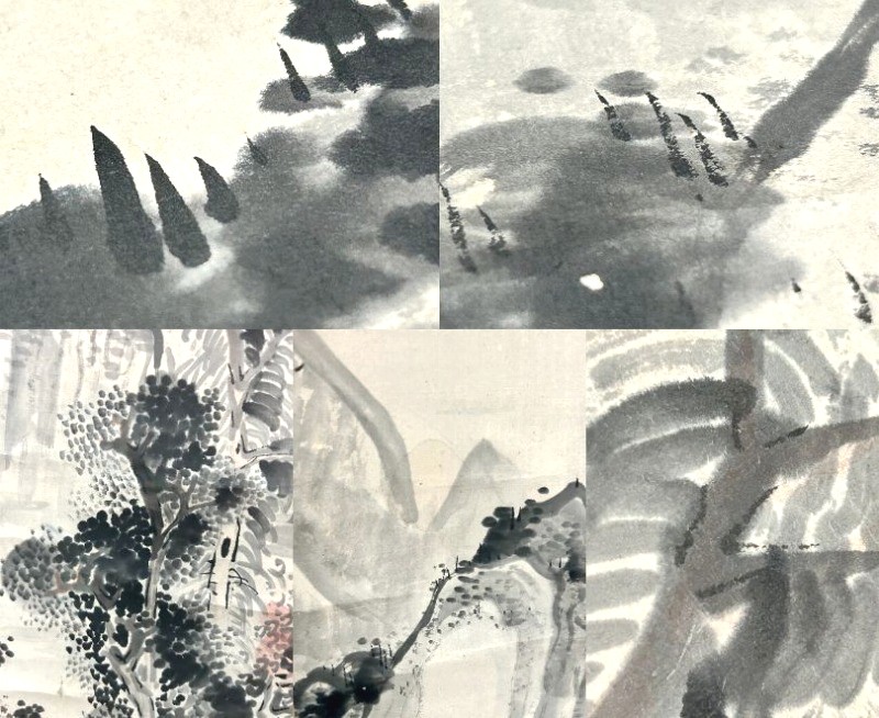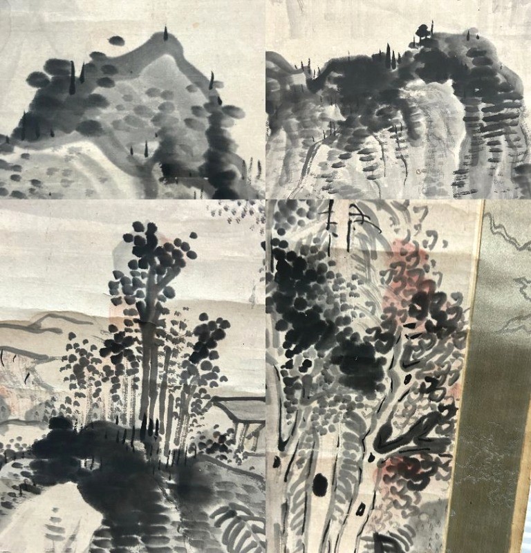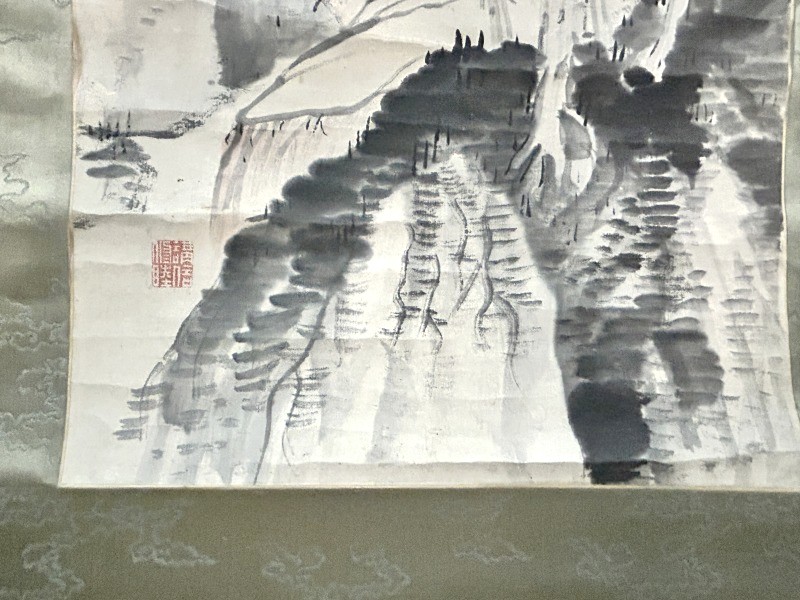 > ◇古筆掛軸(銘・印あり)平咸先生皿水圓 斗南題 【墨彩山水図「静謐なる山水」一幅長さ180cm × 巾34cm 木箱両面筆書付】落款有 Q10076