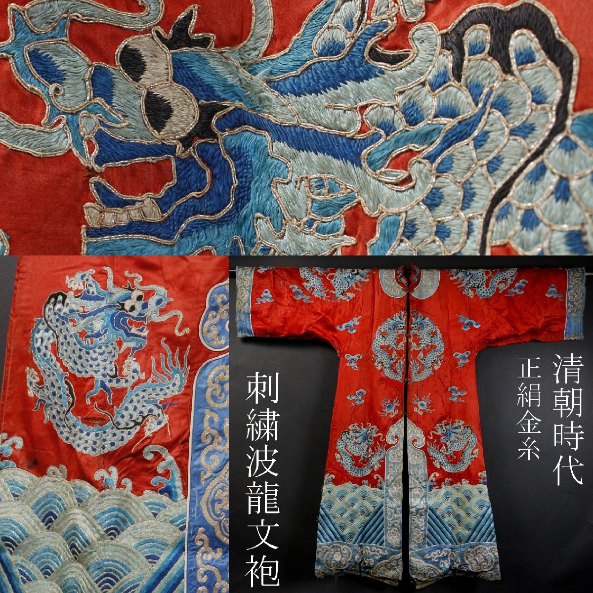 - 【LIG】中国美術 清朝時代 刺繍波龍文袍 宮廷衣装 正絹 金糸 古服 唐物 蒐集家収蔵品 ② [-RPP]25.10