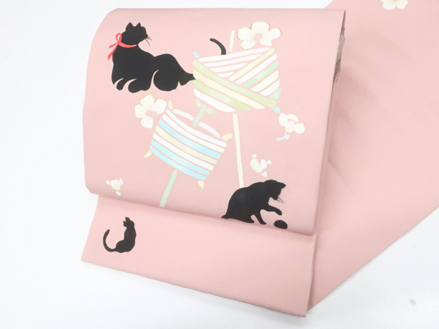 - 《古美術京松》九寸名古屋帯 オリジナル 太鼓柄 金駒刺繍 猫 開き仕立て 正絹 r7b10-185