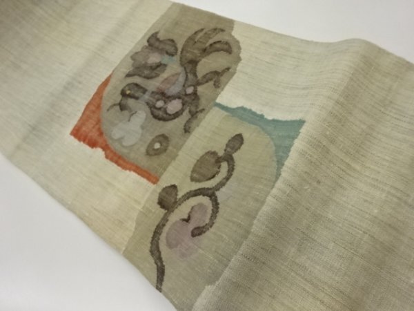 > ys7557012; 宗sou 手織り紬横段に抽象鳥・花唐草模様織出し名古屋帯【着】