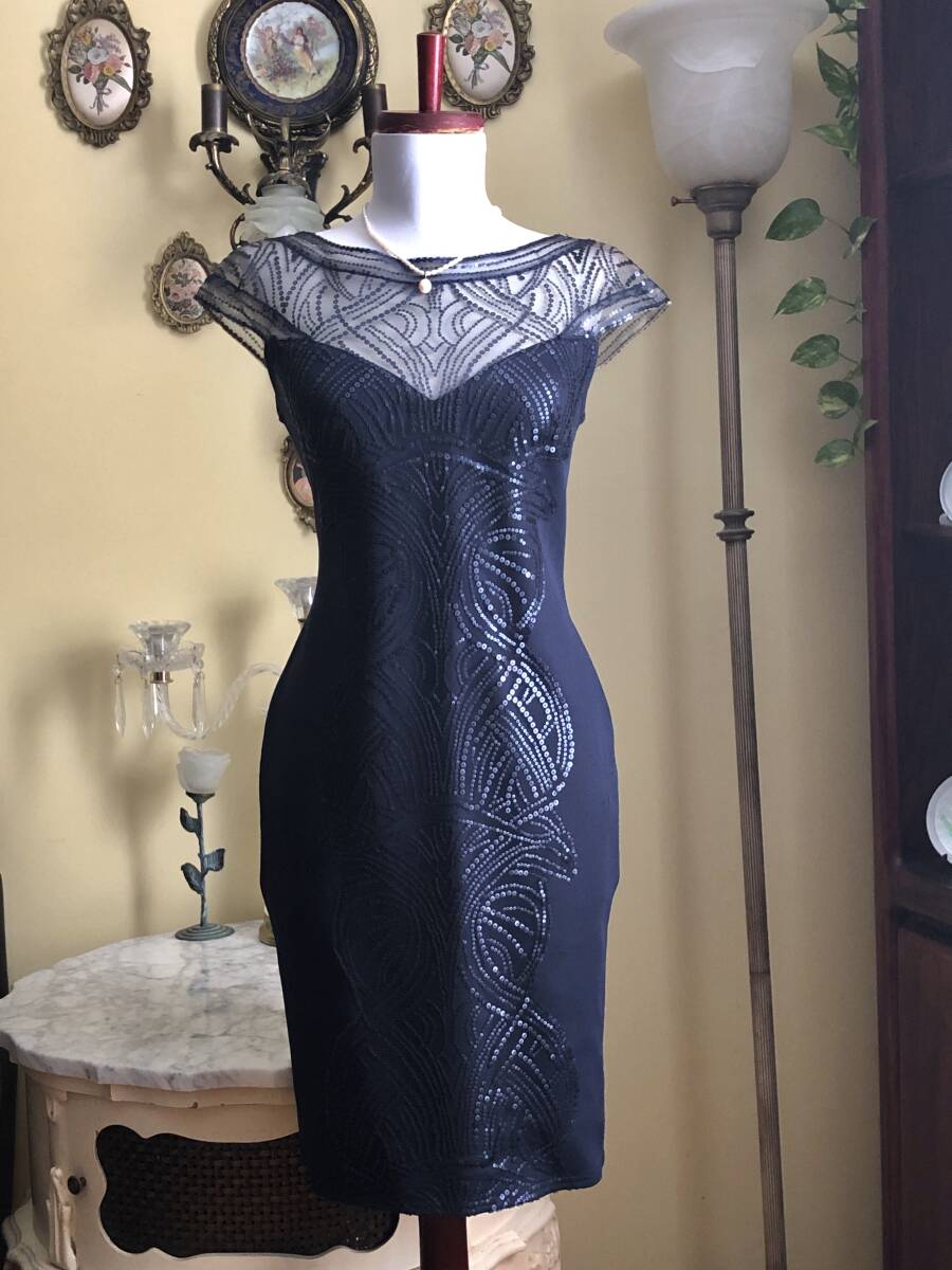 > 【TADASHI SHOJI/タダシショージ】スパン刺繍/ネットレーストリム/濃紺ストレッチ/カクテルドレス (US・PS/9号S~M)#241