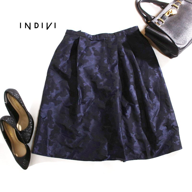 - 美品 インディヴィ INDIVI 株) ワールド 合物 迷彩柄 サファリ ジャガード フレアスカート 9号 38 ネイビー 紺 ナイロン質感 お洒落 柄