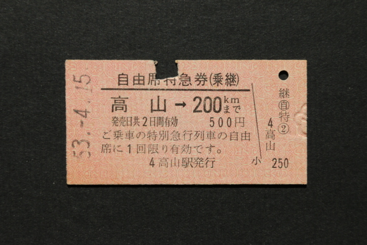 - 自由席特急券(乗継) 高山→ 200㎞ 500円