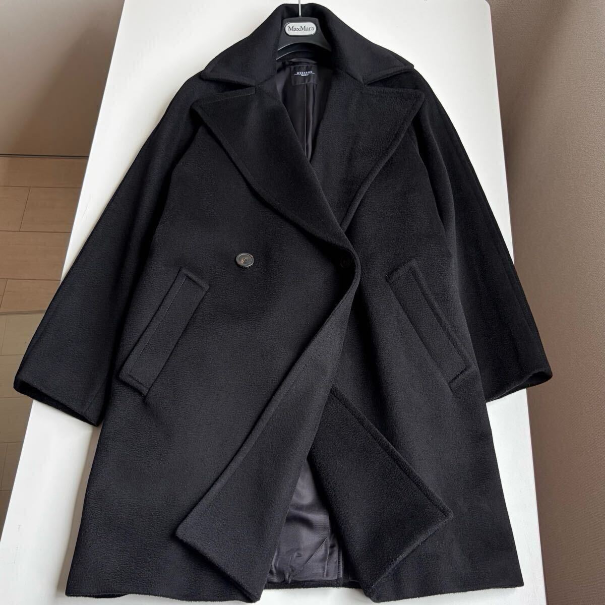 - 超高級 希少 艶感光沢感◎ピュアウール セレブ御用達一級品ふんわりコート ビックカラー MaxMara マックスマーラ 近年物 定番ブラック 38