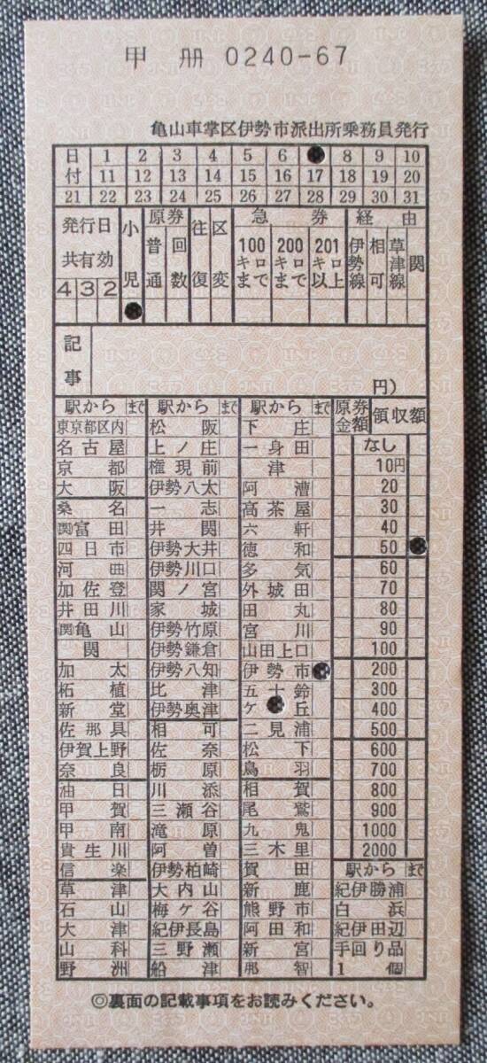 - 国鉄/天王寺局 亀山車掌区伊勢市派出所乗務員 車内補充券