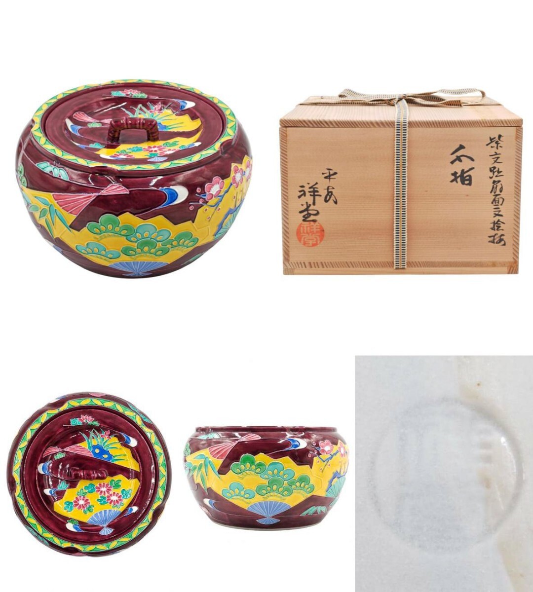 > ≪茶道具≫ 【手塚祥堂(手塚央)】『紫交趾 扇面文 捻梅 水指』底部在印 水指』底部在印 桐共箱 栞 紙外箱 真作保証