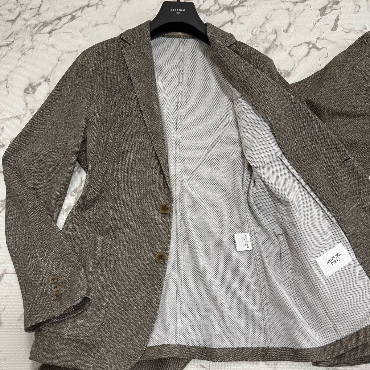 > 現行タグ メンズビギ【Men's Bigi】セットアップスーツ テーラードジャケット ブルー ストレッチ サイズL シャンブレー グレー