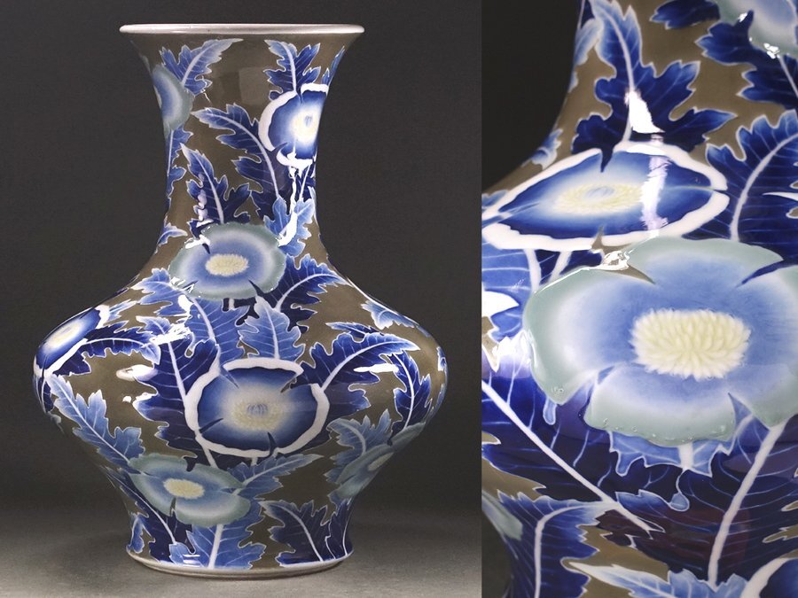 > ∇花∇昭和初期【オールド香蘭社】謹製 釉下彩貼花芥子文花瓶 高さ38cm 香蘭社製染付銘 滅多にご覧頂けない美術館級の名品です