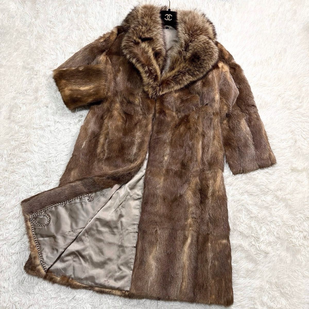- 美品/XL●GIFU MOUHI ロング丈 ミンク ファーコート 毛皮 裏地総柄 花柄 刺繍 ベージュ ブラウン 13 レディース 高級 岐阜毛皮 MINK