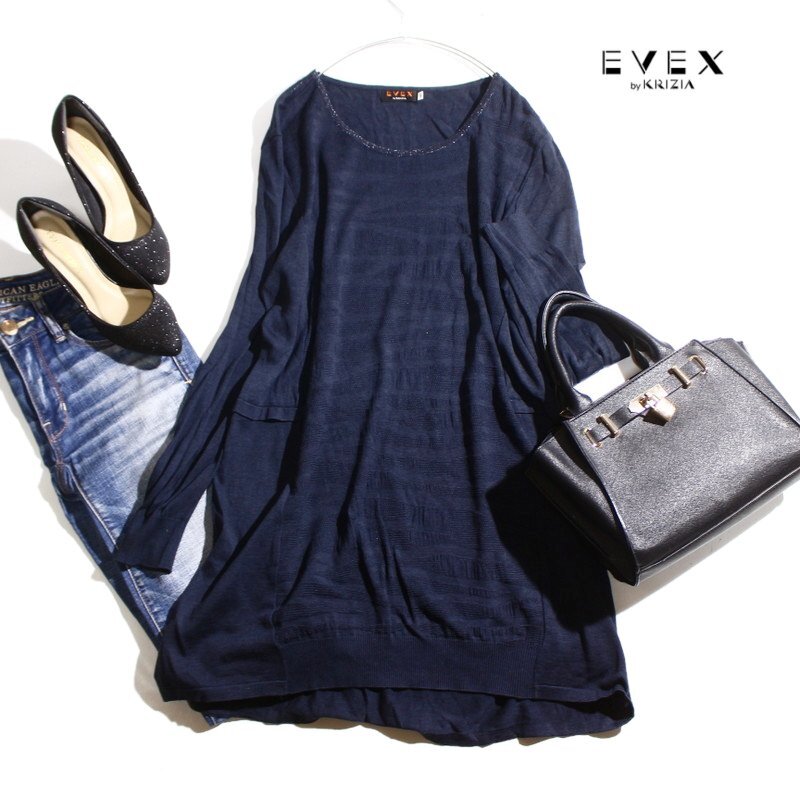- 美品 エヴェックス バイ クリツィア EVEX by KRIZIA 三陽商会 春 ミセス ジャガード ゼブラ ラメ ロングニットカットソー ネイビー 紺 42 L