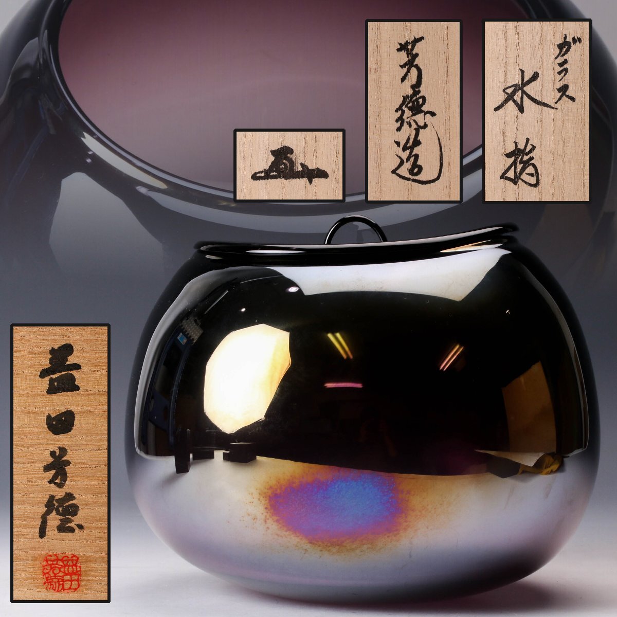 【佳香】益田芳徳 ガラス水指 裏千家十五代鵬雲斎(汎叟宗室)書付箱 塗蓋 茶道具 本物保証