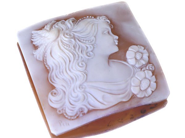- 【ジュエリー極】作家品サイン有り 華やかな貴婦人と小鳥と花の彫刻 高級シェルカメオルース 46.2mm×45.4mm w5828i【送料無料】