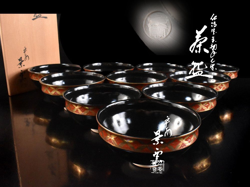 - 【雲】某収集家放出品 平安 景雲 黒仁清 七宝絵付 茶碗 10客 在銘 共箱 古美術品(懐石料理道具 旧家蔵出)Y7155 LTcfds