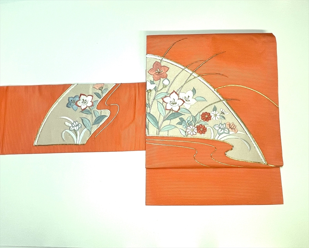 - 花とら●リサイクル帯 名古屋帯 夏帯 袋帯 橙 絽 桔梗 秋草 刺繍 251011