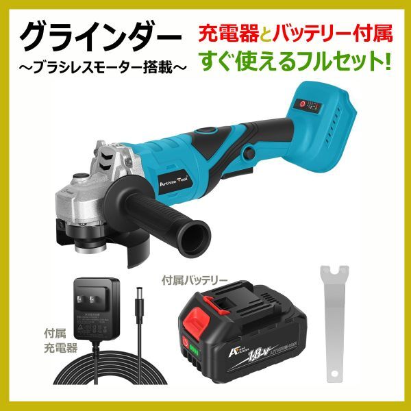 > グラインダー 充電器・バッテリー付フルセット AT-GR01B-BT ディスクグラインダー ブラシレスモーター搭載 マキタ18Vバッテリー使用可