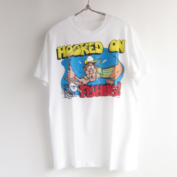 > 90s HOOKED ON FISHING 半袖Tシャツ 白系 メンズM程度 フィッシング 魚 釣り好きの方に 丸首 丸胴 ビンテージ ギャグ D139-01-0092XVW