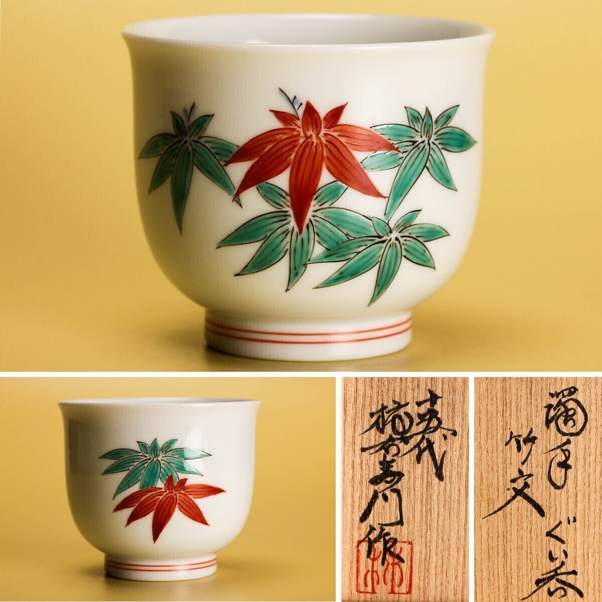 - 十五代 酒井田柿右衛門 本人作 濁手竹文ぐい呑 共箱 共布 栞 本物保証