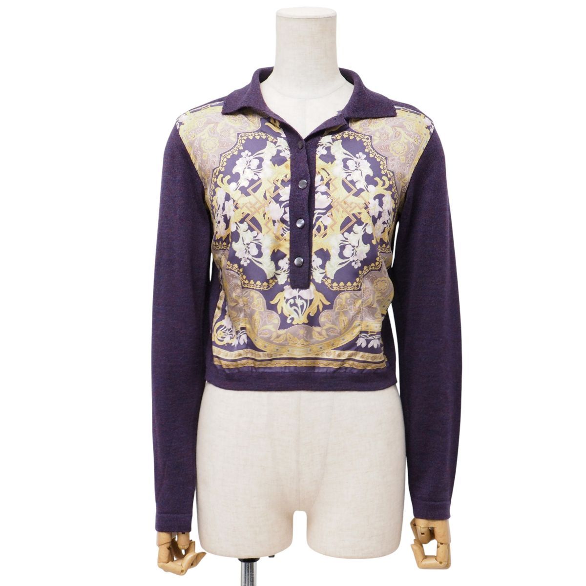 - TJ3387☆エトロ ETRO シルク×ウール 切替 ニット セーター ハーフボタン トップス 長袖 襟付き 総柄 パープル系 サイズ40