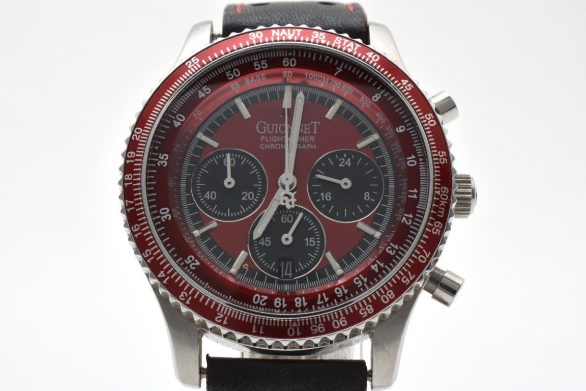 - GUIONNET ギオネ フライトタイマー 腕時計 メンズ クォーツ式 クロノグラフ 赤文字盤 シルバー 3針 デイト 電池式