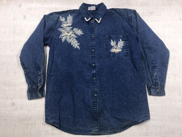 - tarado オールド レトロ カントリー 古着 ビーズ フラワー リーフ 刺繍 ケミカルウォッシュ 長袖 デニム シャツ メンズ コットン100% 濃紺