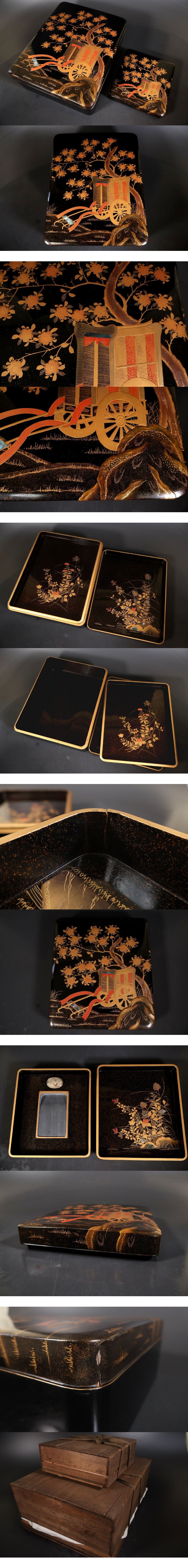 - 【小】5341K 時代蒔絵 時代金蒔絵御所車文文庫硯箱 文庫硯セット 内金梨地 時代箱有 書道具 江戸後期~明治時代