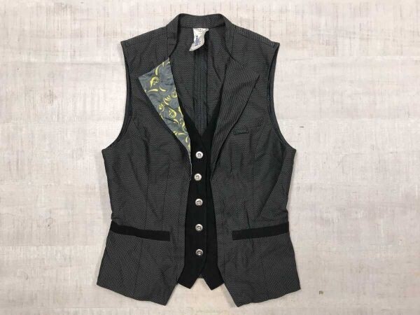 - フェアリーグランジ Y2K 00s モード 古着 襟総柄 切替 フェイクボタン ジップアップ レイヤード ジレ ベスト レディース 7号 グレー