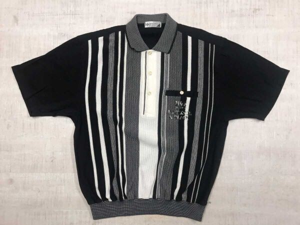> MAGIX SON BLACK オールド レトロ トラッド 古着 ストライプ 英字 刺繍 ギャザー 半袖 コットンニット ポロシャツ メンズ L 黒白