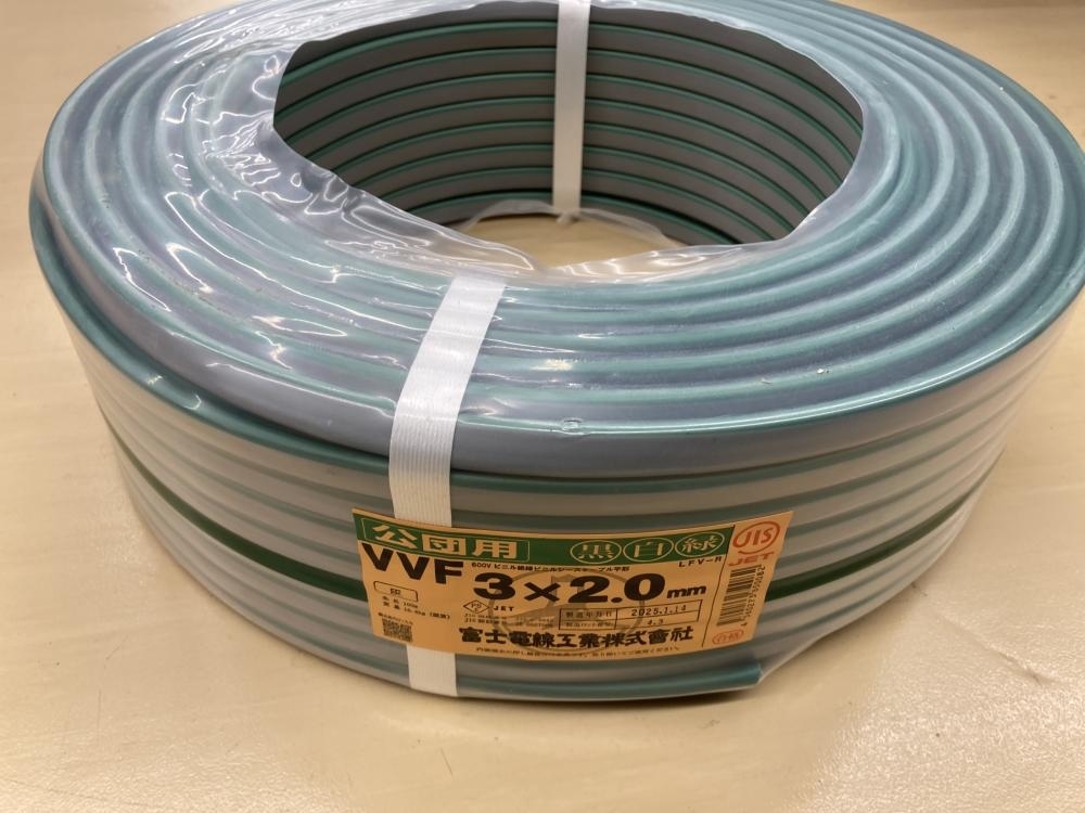 > 022●未使用品・即決価格●富士電線 VVFケーブル 3×2.0 黒白緑 伝票直貼り発送です。