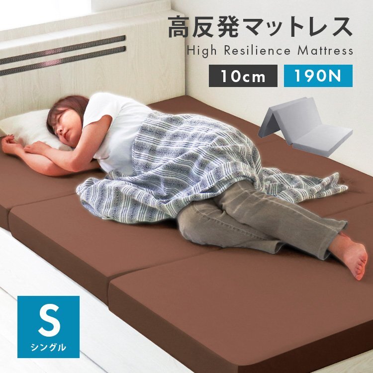- 高反発マットレス シングル 三つ折り 厚さ10cm 高反発ウレタン 洗えるカバー 体圧分散 ベッド 寝具 敷布団 マットレス グレー