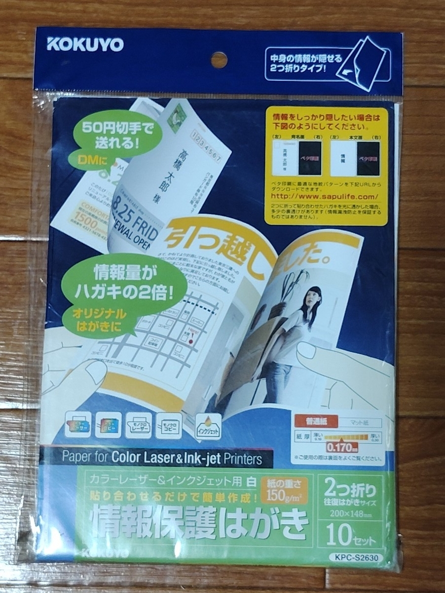 - Y2150 : KOKUYO カラーレーザー&インクジェット用 情報保護はがき 2つ折り10セット
