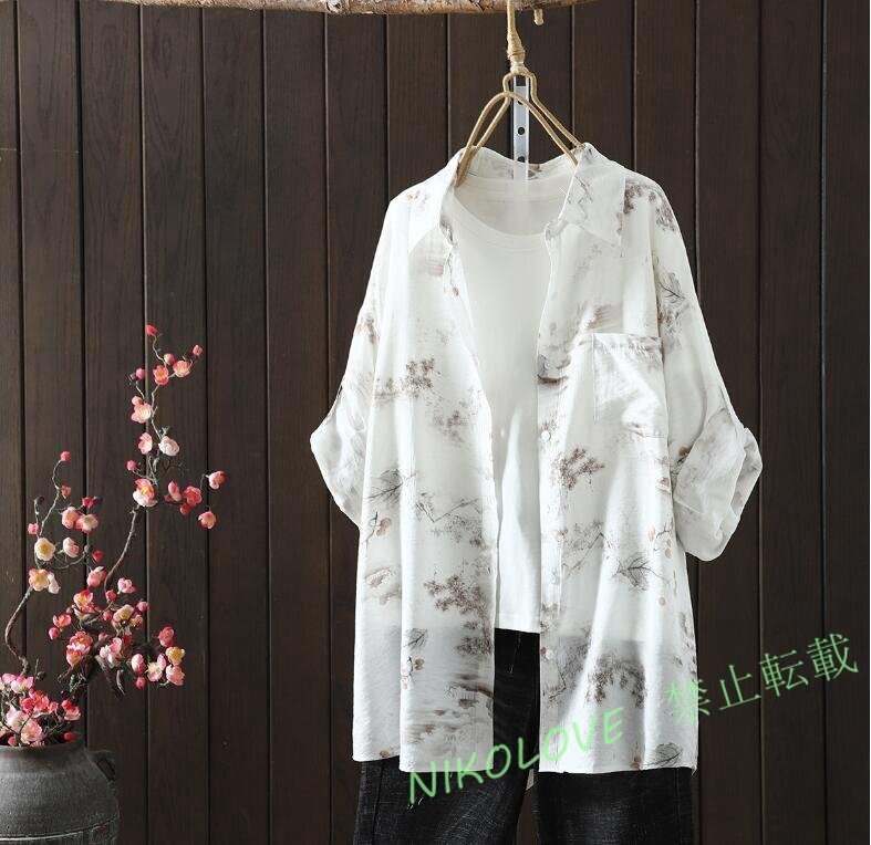 > ☆新品 カーディガン フリーサイズ ワイシャツ チュニック トップス ナチュラル 綿100% 通気性肌触り抜群 サラサラ プリント花柄