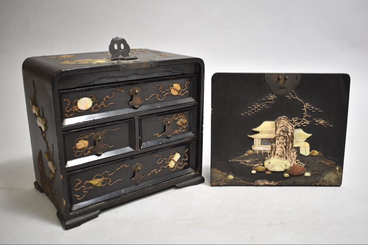 - 【英】A1039 時代 黒漆嵌玉螺鈿小箪笥 中国美術 朝鮮 韓国 箱 収納 青貝 漆器 漆芸 骨董品 美術品 古美術 時代品
