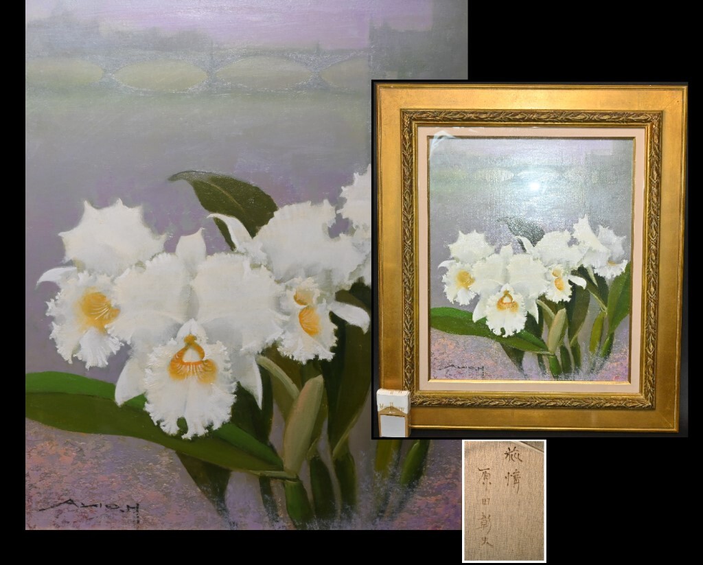 > 真贋保証■原田彰夫■ 油彩『旅情』F8号 洋蘭 カトレア 額装 風景と花の絵 愛知県生 ル・サロン展銅賞 リアリズム 検:モンサンミッシェル