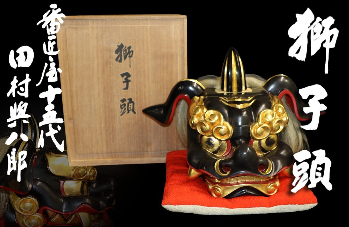 > 【江】番匠屋十五代 田村興八郎 与八郎 金塗黒塗獅子頭 座布団付 高さ27㎝ 共箱 古美術品(獅子舞縁起物祭演芸正月) AX1784 CTDBeoii