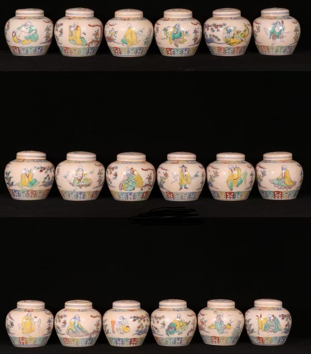 > 明代 成化年製 闘彩赤胎十八羅漢紋天字缶 古陶磁器 陶芸 唐物 古賞物 時代物 骨董品 旧家蔵出 中国古玩 東洋彫刻 古美術品 文案古置物1030