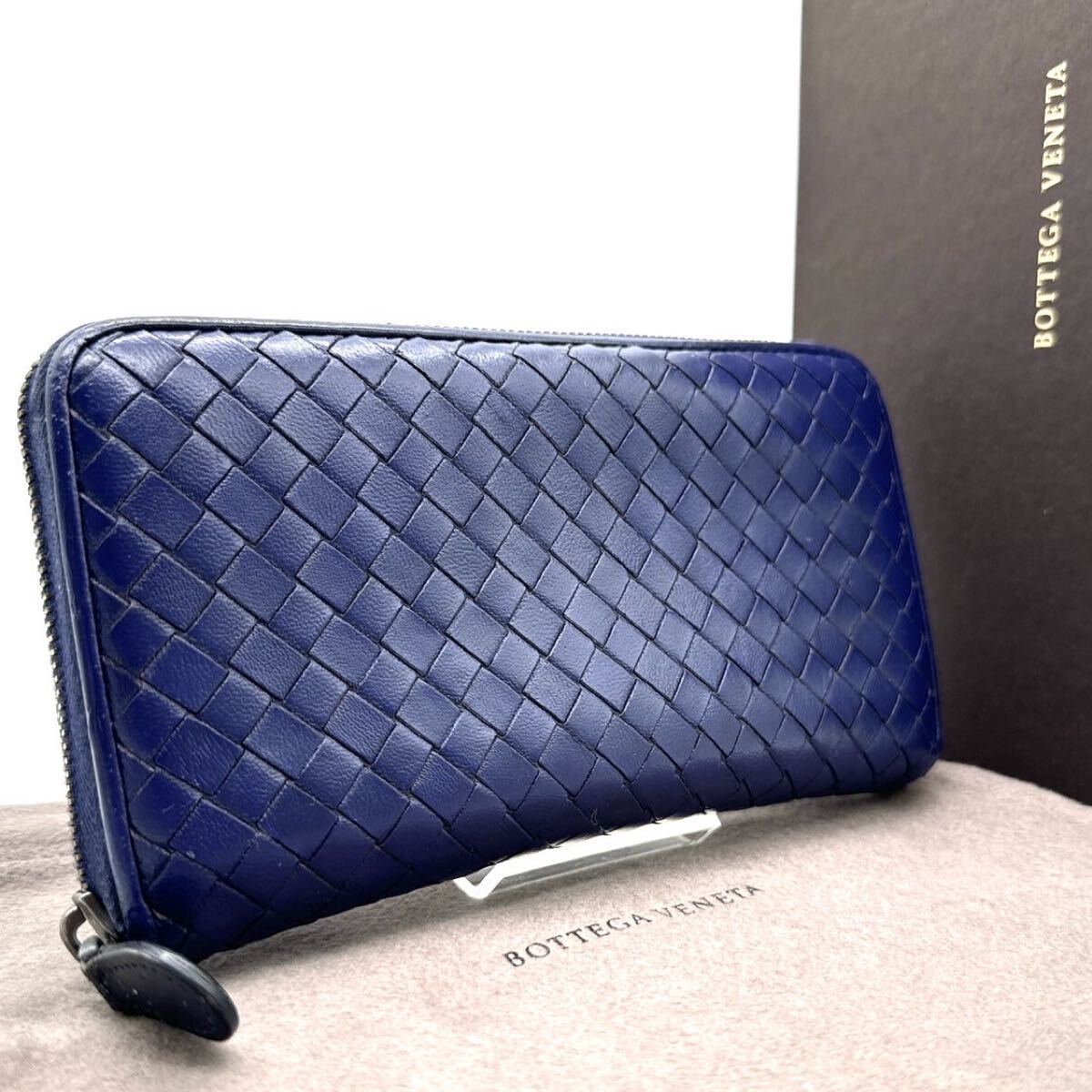 - 極美品◆BOTTEGA VENETA ボッテガヴェネタ 長財布 イントレチャート ラウンドファスナー ブルー 青 ロングウォレット メンズ