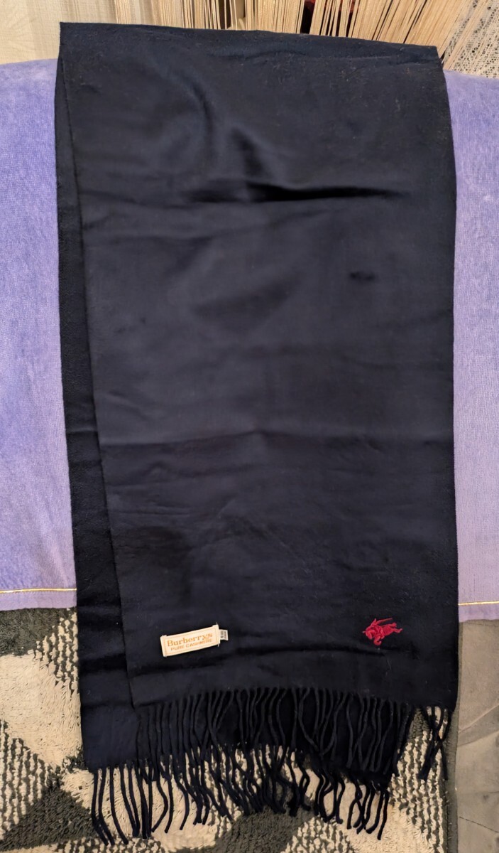> Burberry'sマフラー■バーバリー■ピュアカシミア■毛100%■ダークネイビー/濃紺■馬刺繍/エンジ■タグ乱れ無し■経年保管品■畳みシワ有り